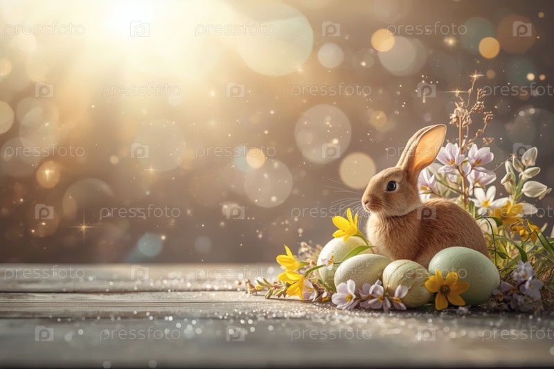 Пасхальные яйца, пасхальный кролик и весенние цветы на деревянном фоне. Концепция яркого праздника Пасхи в 2026 году. Хорошая открытка. Баннер