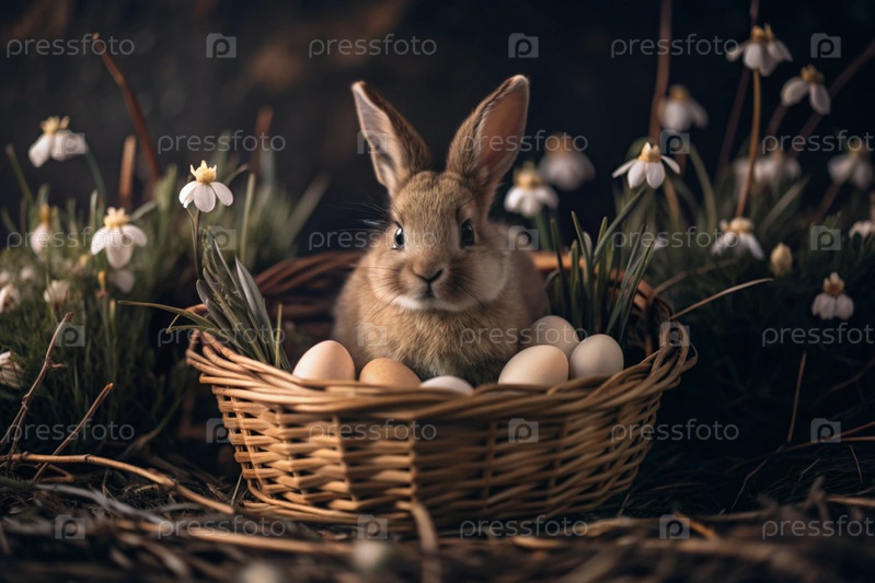 Баннер. пасхальный кролик в корзине из красочных пасхальных яиц вокруг весенних снегопадов и первичной розы. концепция праздника Пасхи