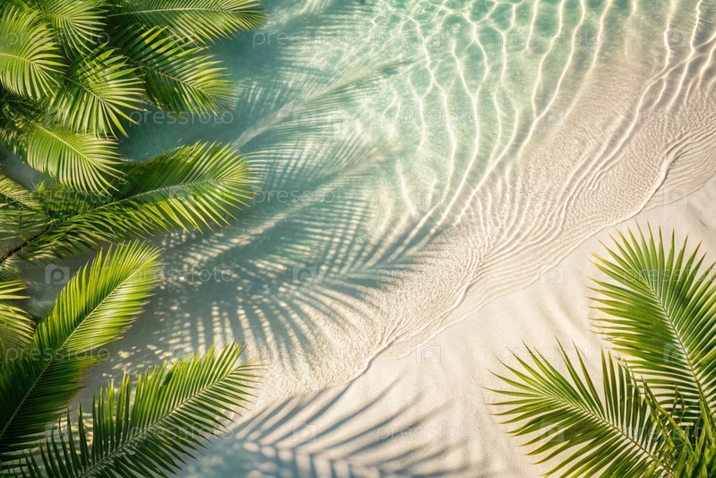 Концепция летнего отдыха на пляже. Вид тропических листьев на поверхности воды. Тень пальмовых листьев на белом песчаном пляже. Красивый абстрактный фон для баннера