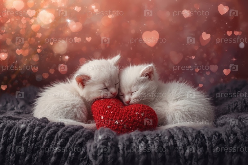 Концепция Дня святого Валентина. красное вязаное сердце и два белых котенка. открытка с котятами на вязанном одеяле