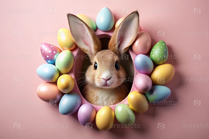 Известный праздник. милый пасхальный кролик заглядывает из ямы с красочными яйцами вокруг. концепция счастливой Пасхи