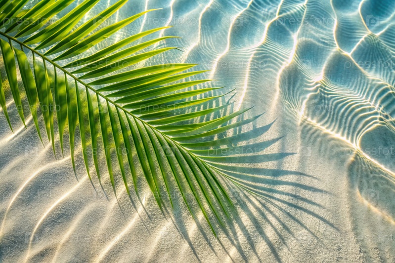 Концепция летнего отдыха на пляже. Вид тропических листьев на поверхности воды. Тень пальмовых листьев на белом песчаном пляже. Красивый абстрактный фон для баннера