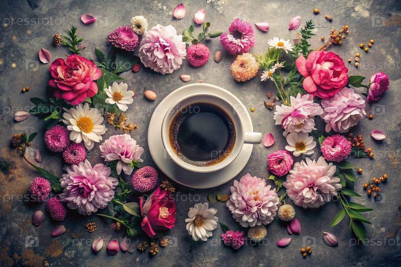 Красивая открытка. чашка кофе с тарелкой и весенними цветами. красивый натюрморт. весна, лето. доброе утро концепция