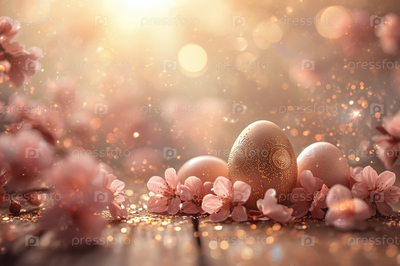 Концепция яркого пасхального праздника в 2026 году.Концепция ярких пасхальных праздников.Нежные розовые пасхальные яйца и вишневые ветви на деревянном фоне