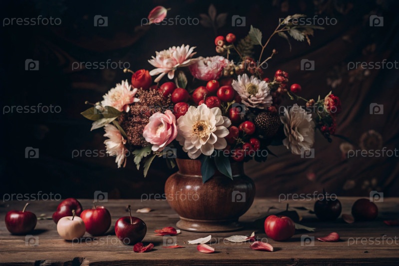 Красочное лето, осенний букет цветов различных красных, розовых, белых оттенков в вазе и спелые красные яблоки на столе