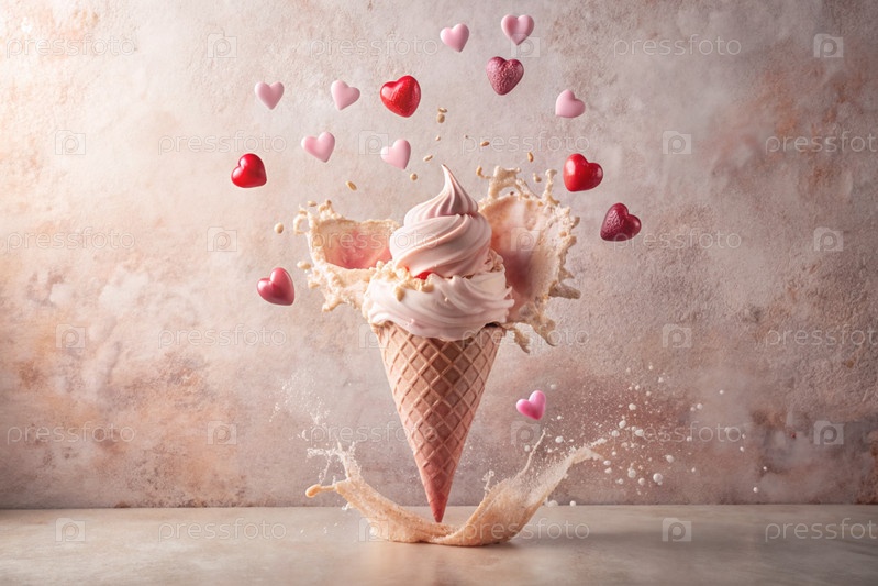 Сладкий десерт. Любовь к мороженому. Сердечно-образный конус мороженого с брызгами, сердцами и пятнами. Концепция Дня святого Валентина. Баннер, реклама