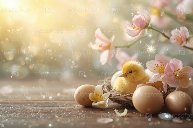 Пасхальные яйца, желтая курица и весенние цветы на деревянном фоне. Концепция яркого пасхального праздника в 2026 году