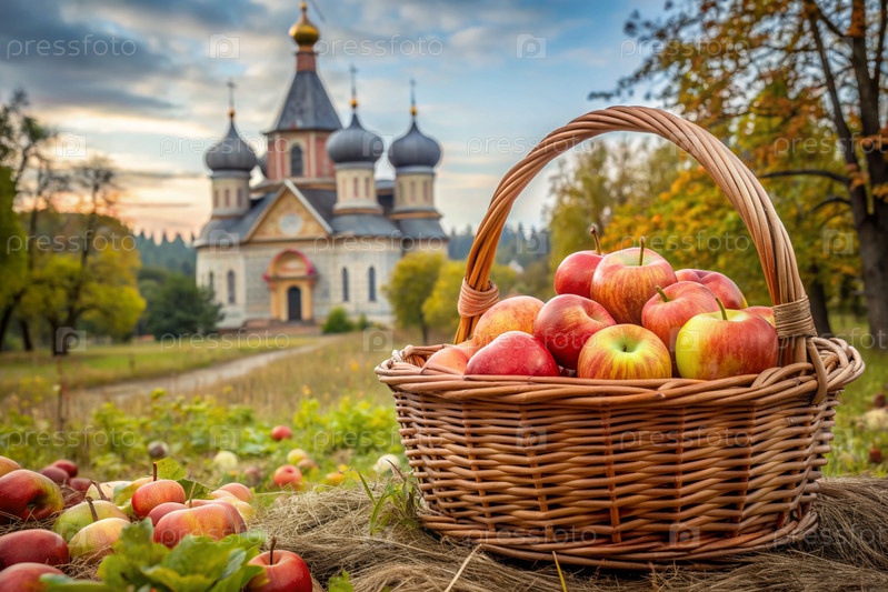 Концепция русского православного праздника Apple resort.Прекрасная плетеновая корзина из виноградных лоз с красными спелыми яблоками на фоне православной церкви