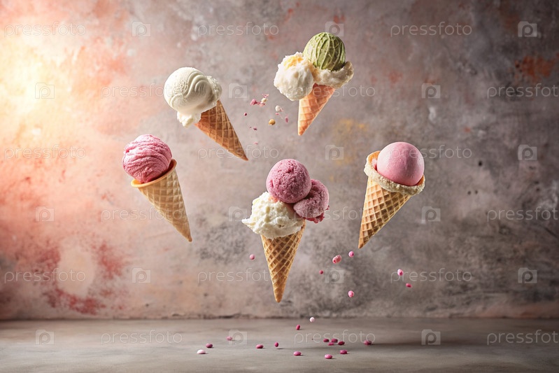 сладкий десерт. морозильные шишки с различными вкусами на бетонном сером фоне. Всемирный день мороженого