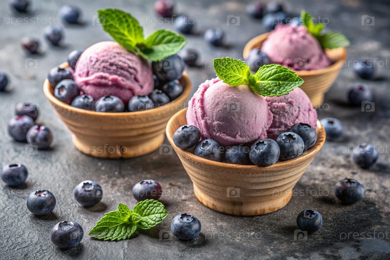 сладкий десерт. любовь к мороженому. шар мороженого и свежие черники. баннер, реклама