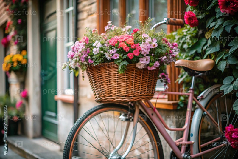 Красивый ретро-велосипед с цветами в корзине стоит за пределами летнего дома.Лето наступило.Городской транспорт