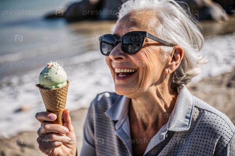 Портрет необычной, стильной, модной пожилой женщины, пенсионерки 70 лет с мороженым в руках во время отпуска на пляже у моря