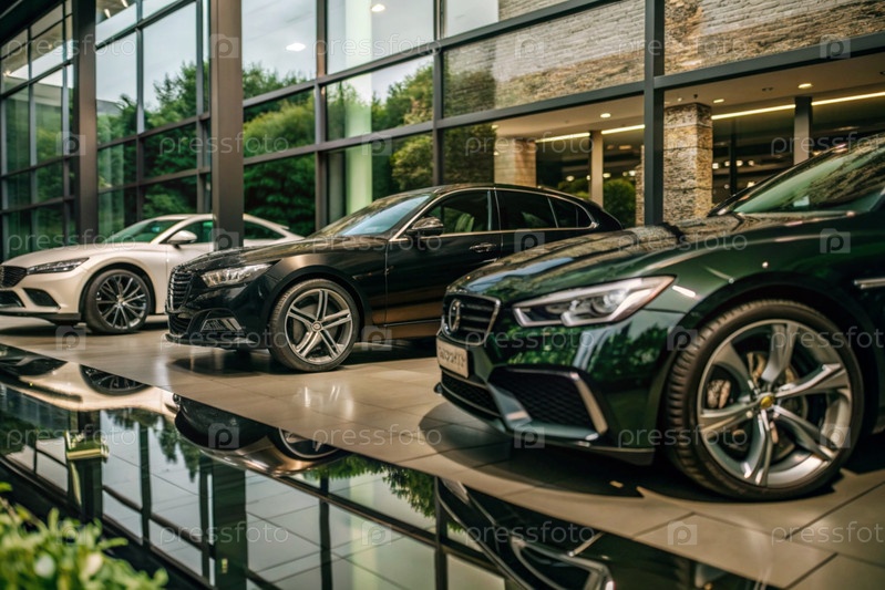 Офис современного автосалона. Бизнес-концепция продаж и аренды автомобилей. Новый автомобиль припаркован в современном автосалоне. Концепция автолизинга и страхования. Электрическое транспортное средство