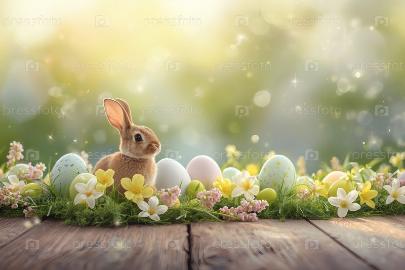 Пасхальные яйца, пасхальный кролик и весенние цветы на деревянном фоне. Концепция яркого праздника Пасхи в 2026 году. Хорошая открытка. Баннер