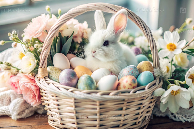 Баннер. пасхальный кролик в плетеновой корзине, наполненной красочными пасхальными яйцами. концепция весенних праздников Пасхи