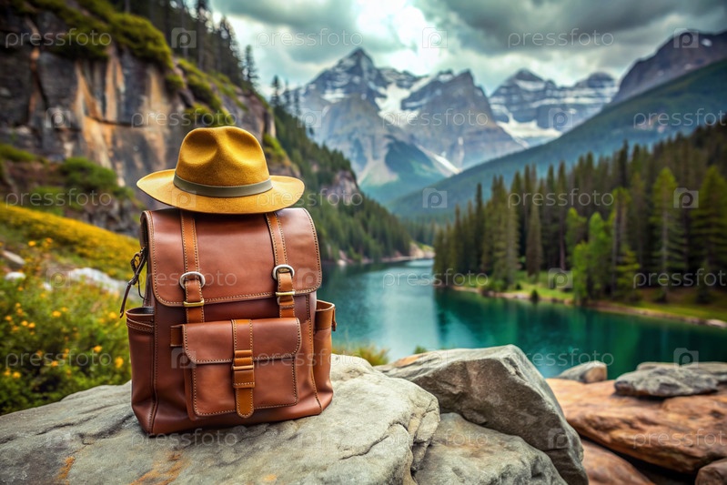 Стильный коричневый кожаный рюкзак и шляпа на фоне живописного озера и гор