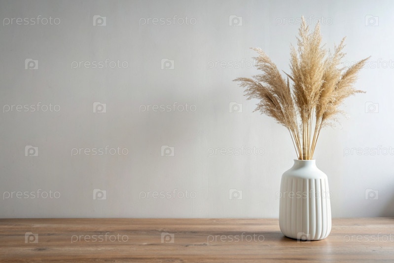 Современная белая керамическая ваза с сухой травой на деревянном столе Скандинавский интерьер Пустая белая стена со тенью из окна
