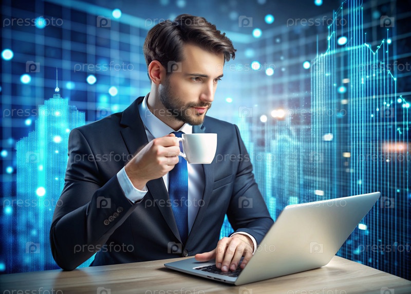Молодой человек в костюме работает на ноутбуке в офисе с цифровыми кодами на виртуальном экране Цифровые технологии будущего Разработка программного обеспечения