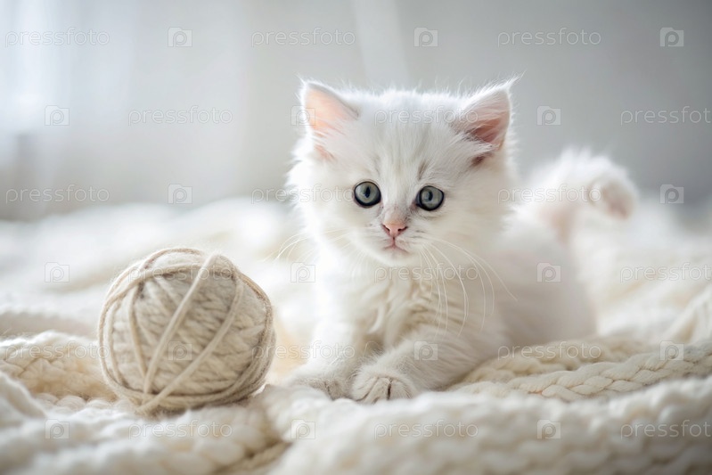 Животные. маленький пушистый белый котенок играет с шариком пряжи на белой кровати. любопытный кот лежит на белом одеяле и смотрит в камеру. текстиль, вязание