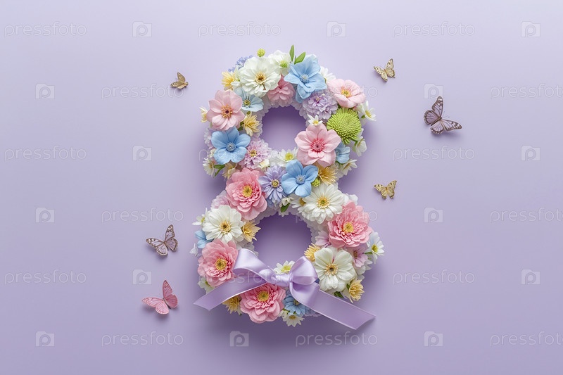 Международный женский день. баннер, флаер, красивая открытка на 8 марта. цветы в форме цифры восемь и бабочки на лиловом фоне