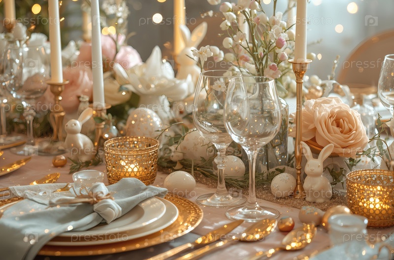 Пасхальный баннер 2026. декоративная тарелка, столовая посуда, стаканы, пасхальные яйца и кролики. концепция празднования Пасхи для кафе и ресторанов