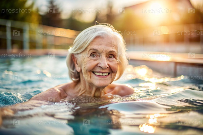Пожилая женщина плавает и занимается водной аэробикой в отопительном бассейне, счастливый и улыбающийся пенсионер