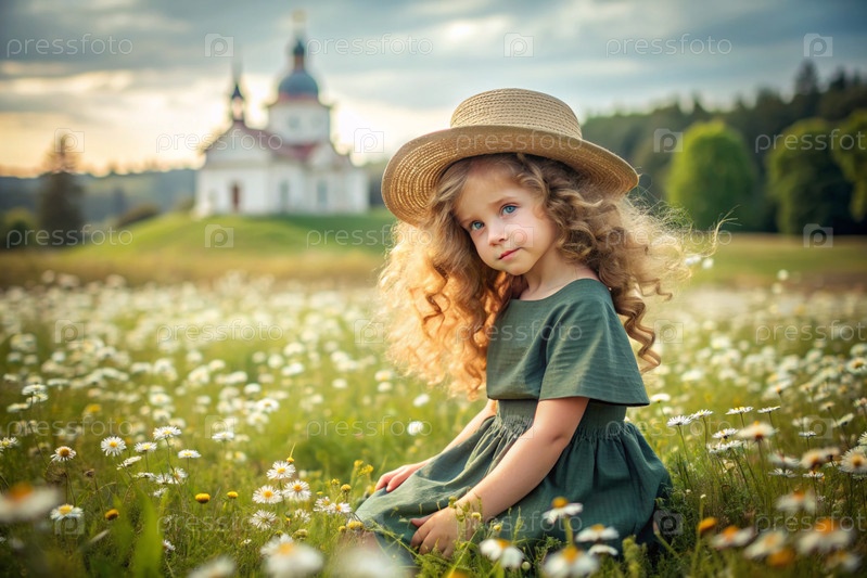 Всероссийский день семьи, любви и верности Красивая маленькая кудрявая девочка в соломенной шляпе с букетом ромашки на фоне поля. День святого Валентина Петра и Февронии