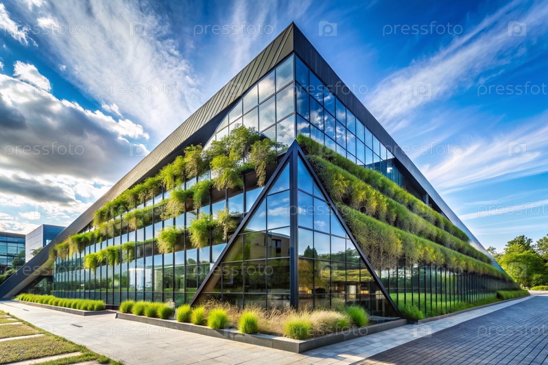 Современная городская экология. Снижение выбросов углекислого газа в городе. Экологически чистое стильное здание с посаженными зелеными растениями для нормализации содержания кислорода в воздухе