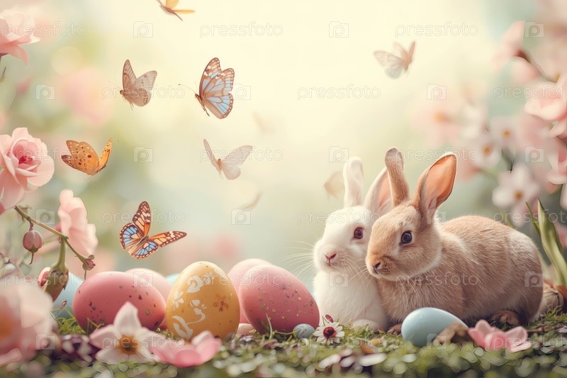 Пасхальные кролики лежат на пасхальных яйцах и смотрят в камеру