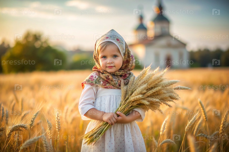 Русская девушка в белом платье и русском полотенце держит золотые колосья пшеницы на фоне созревающего поля и православной церкви