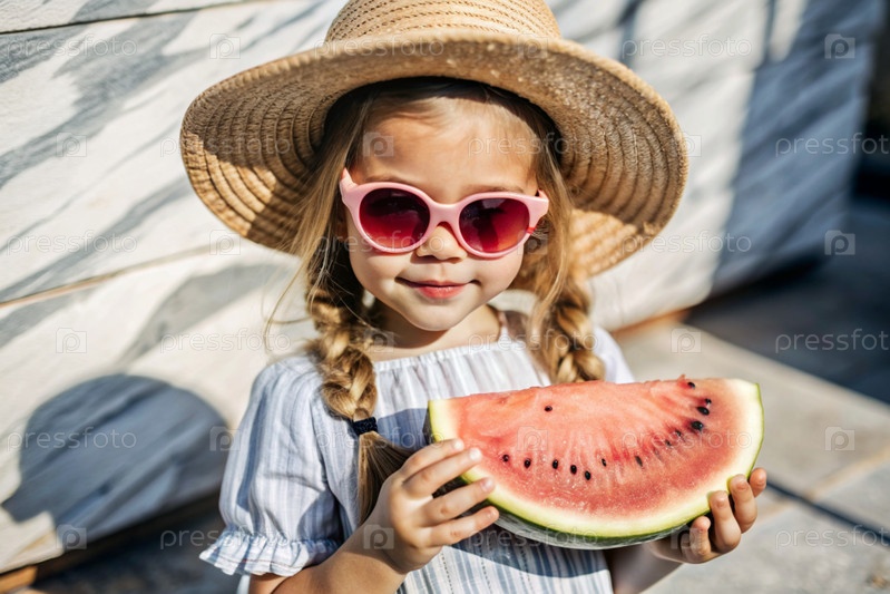 Маленькая девочка в солнцезащитных очках ест арбуз в жаркое лето. забавный счастливый ребенок с арбузом в руках. ребёнок смотрит на камеру, здоровая пища
