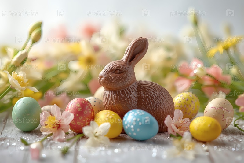 Шоколадное пасхальное яйцо, шоколадный кролик и весенние цветы на деревянном фоне. Пасхальные сладости и лакомства. Концепция яркого праздника Пасхи в 2026 году. Хорошая открытка