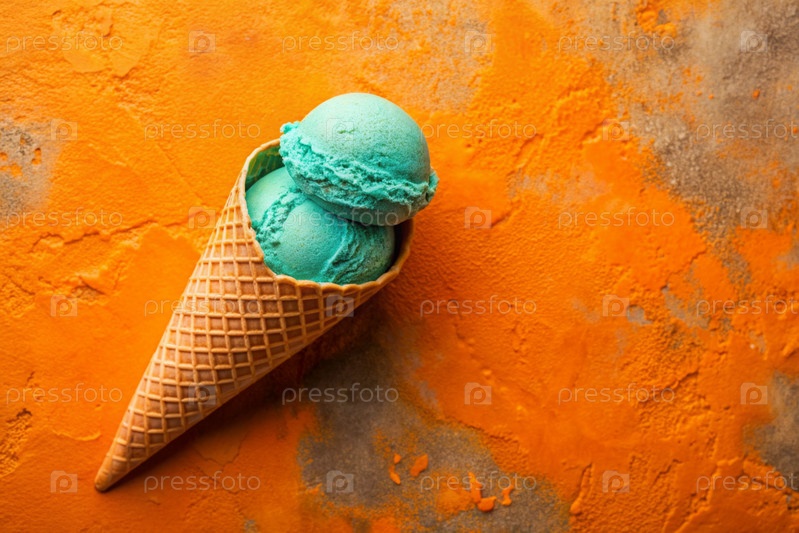 Сладкий десерт. Стильная современная концепция. Бирюзовый мороженый конус на ярко-оранжевом фоне. Всемирный день мороженого