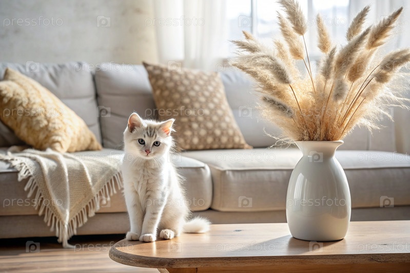 Белый пушистый котенок в современном скандинавском стиле интерьера