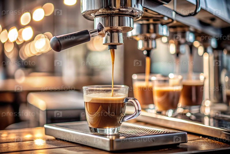Свежеваренный кофе, заливаемый из кофейной машины на размытом фоне кафе или ресторана