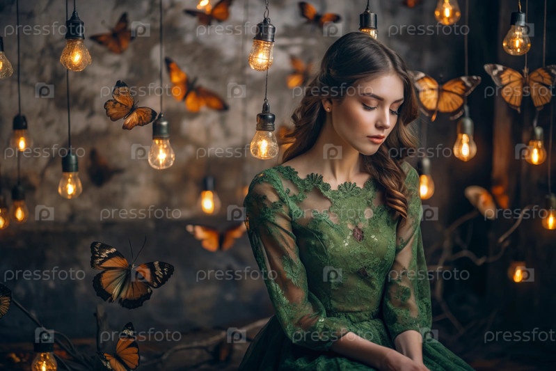 Портрет красивой девушки в зеленом платье среди многих подвешенных лампочек и бабочек, размахивающих вокруг нее