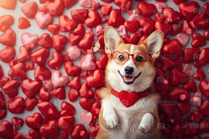 Красивый баннер на День святого Валентина с влюблёнными собаками и красным сердцем. Вид сверху. Романтическая и любящая атмосфера