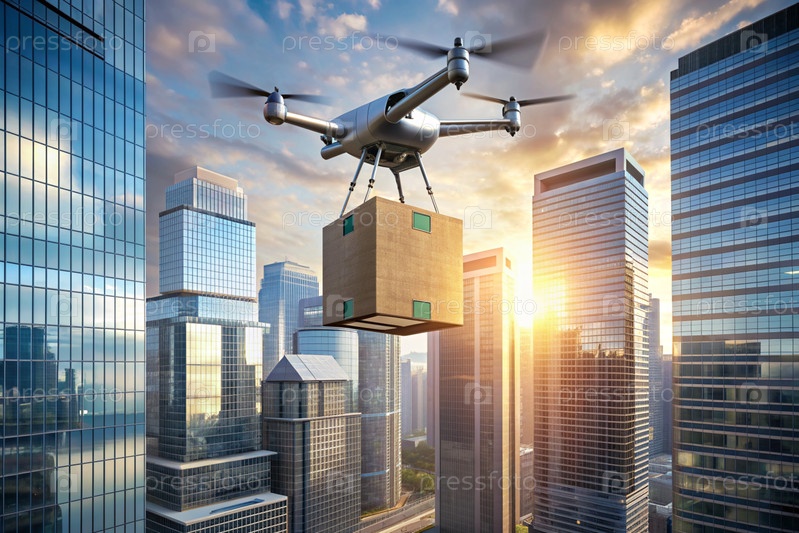 Технология будущего. Дрон доставки несет картонную коробку для человека на веревке. Дрон доставки летает между современными небоскребами. Концепция развития доставки товаров