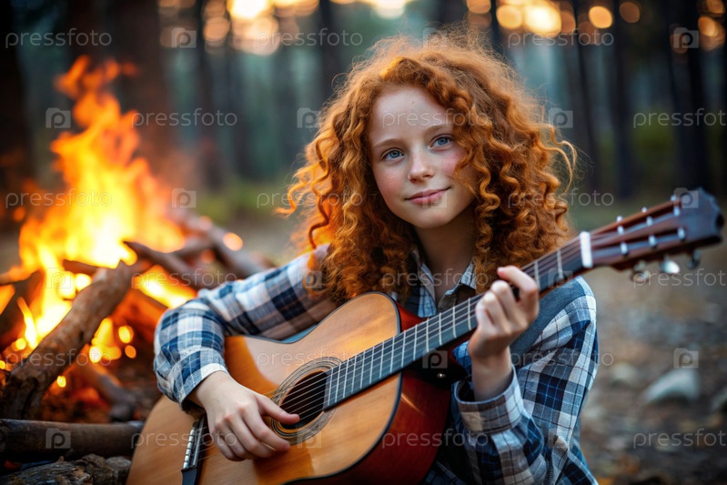 Музыка и хобби. талантливый молодой рыжеволосый музыкант сидит один у костра и сочиняет песни на гитаре. девушка играет спокойную мелодию на музыкальном инструменте