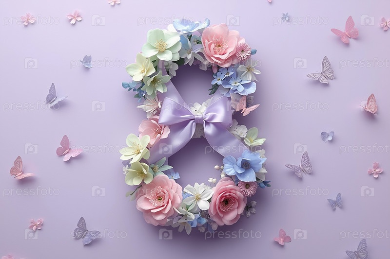 Международный женский день. баннер, флаер, красивая открытка на 8 марта. цветы в форме цифры восемь и бабочки на лиловом фоне