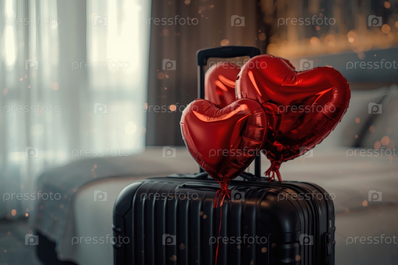 Балонный чемодан в форме сердца в гостиничном номере, чтобы отпраздновать День святого Валентина.Романтический праздник для двух любовников, действие 14 февраля