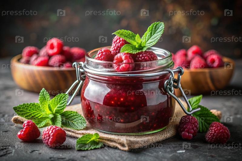 Банка домашней малины, здоровый варенье с мятой на черном фоне.Сохранение и уборка летом