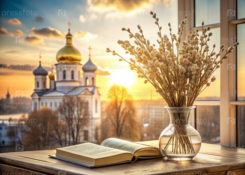 Большой план букета ивы в стеклянной вазе и книги Библии напротив старого белого окна с видом на золотые куполы храма и заходящее солнце