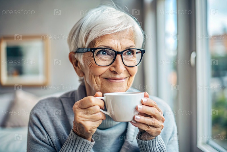 Пожилая пенсионерка, современная бабушка в очках, пьет кофе из кружки во внутренней части гостиной, сидя на стуле дома под естественным светом