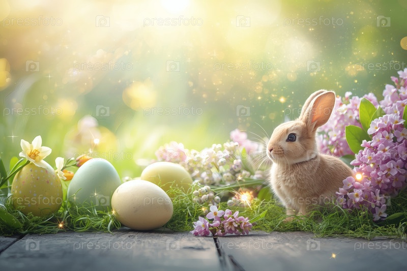 Пасхальные яйца, пасхальный кролик и весенние цветы на деревянном фоне. Концепция яркого праздника Пасхи в 2026 году. Хорошая открытка. Баннер