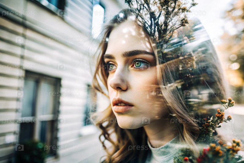 Портрет молодой женщины.Концептуальное искусство Клубовое изображение на фоне города с двойной экспозицией и визуальными эффектами