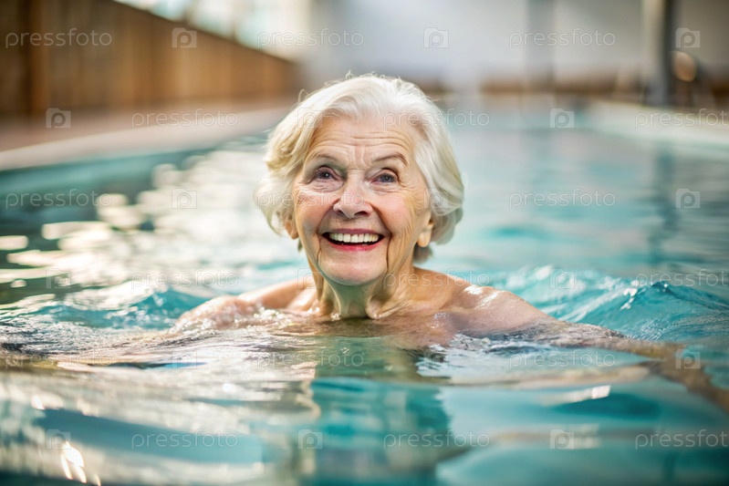 Пожилая женщина плавает и занимается водной аэробикой в отопительном бассейне, счастливый и улыбающийся пенсионер