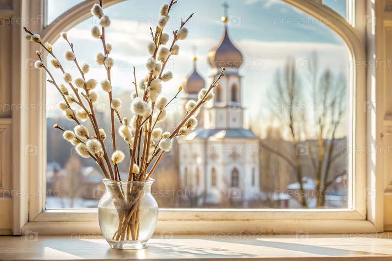 Большой план букета ивы в стеклянной вазе на фоне древнего белого окна с видом на золотые куполы храма и заходящее солнце