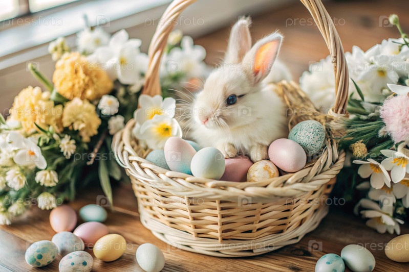 Баннер. пасхальный кролик в плетеновой корзине, наполненной красочными пасхальными яйцами. концепция весенних праздников Пасхи