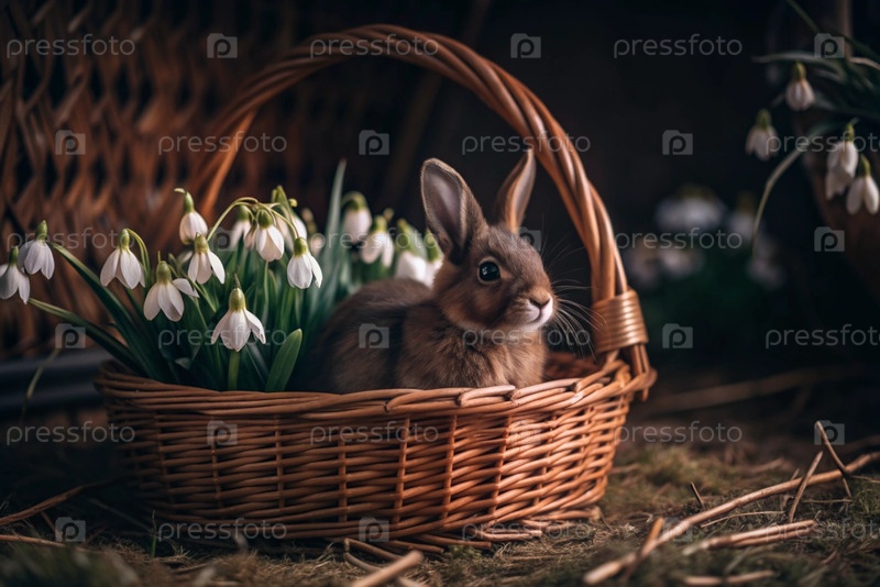 Баннер. пасхальный кролик в корзине из красочных пасхальных яиц вокруг весенних снегопадов и первичной розы. концепция праздника Пасхи